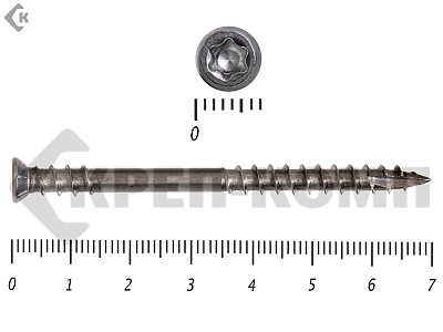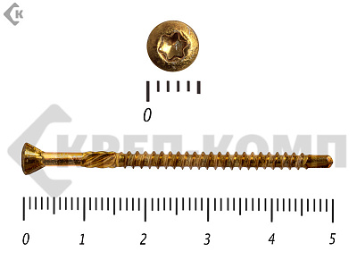 Стандартный крепеж состоит из навершия и стержня. Навершие имеет коническую форму, ориентировано на головку Torx-10. Стержень частично покрыт резьбой. На его конце присутствует сверло, упрощающее работу с твердыми породами дерева.